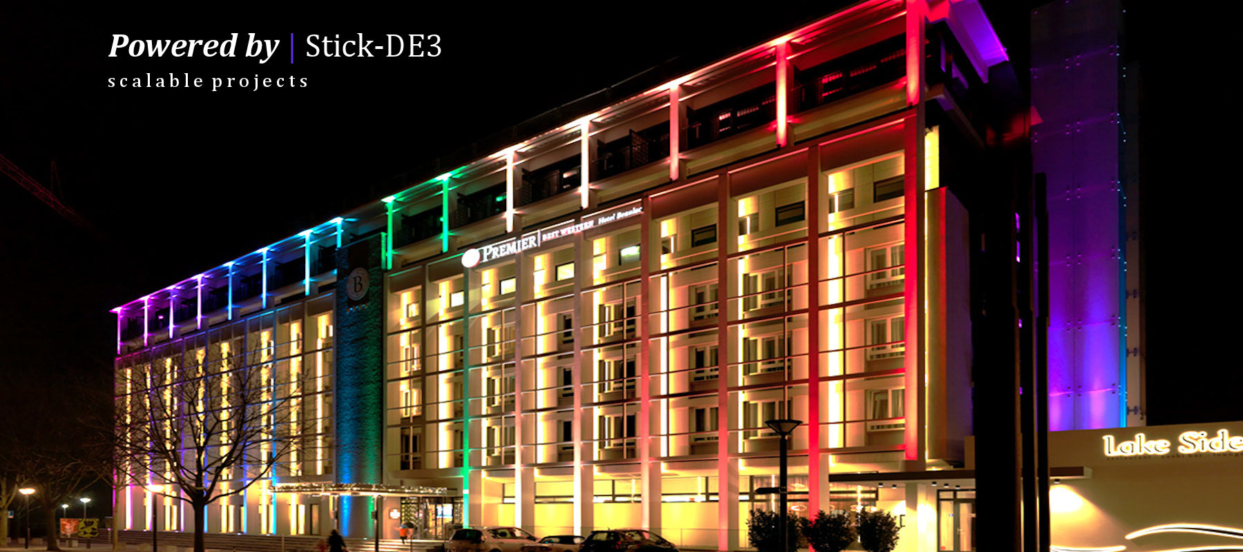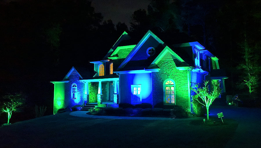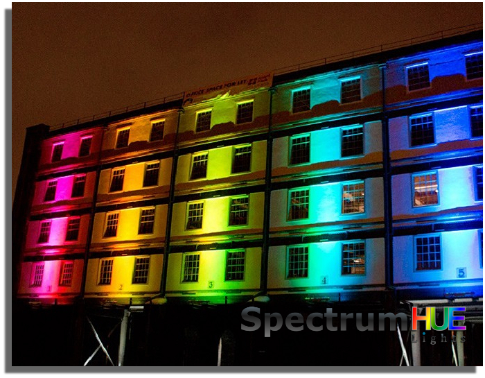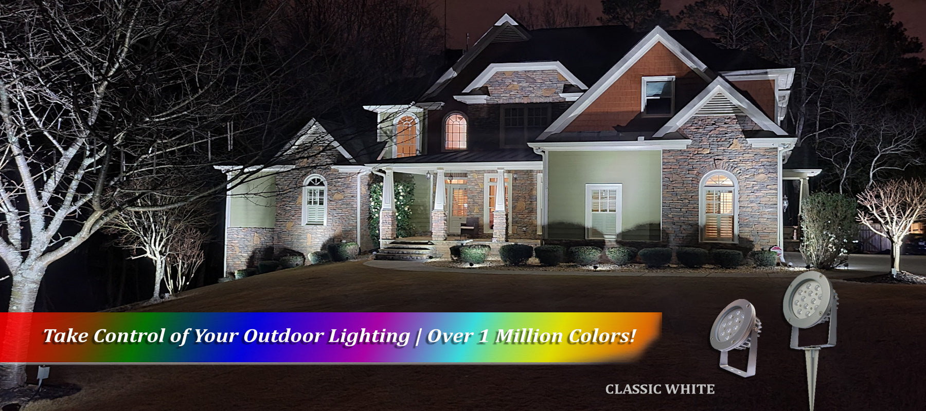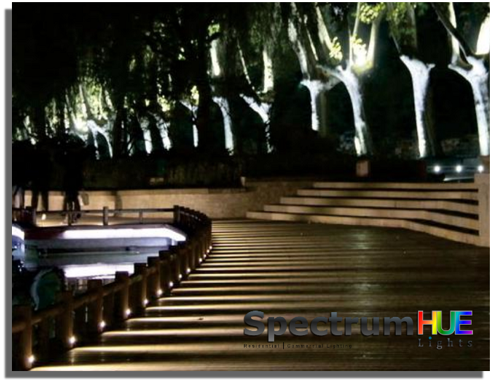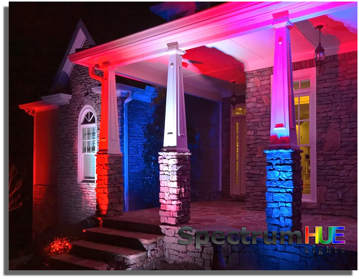 | Simplicity and efficiency, Spectrum HUE lighting systems combine vivid color washing of any architectural feature with advanced lighting control to achieve any lighting effect for your property. Each fixture or group of fixtures can be individually controlled for white or color selection. Create a scene or multiple changeable scenes with color sequences to suit your business brand, theme, holiday or event. Static color or dynamic light motion with color change sequences, to draw attention to your focal point. 99% more efficient than halogen and incandescent lighting. | ![]() |